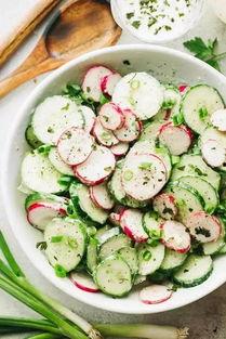 1. 黄瓜沙拉:将黄瓜切成细丝,加入适量的沙拉酱,搅拌均匀即可。